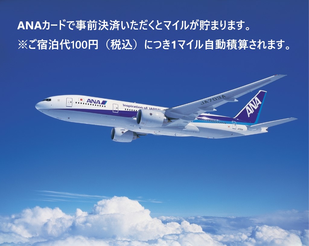 ANAカードと提携致しました! 当ホテル公式ホームページで宿泊予約支払時に、ANAカードで事前決済いただくとマイルが貯まります。 ※ご宿泊代100円(税込)につき1マイル積算されます。 ※ご利用後、マイル積算が確認されるまで、約1~2カ月を要します。 ANA公式サイトにてご確認頂けます